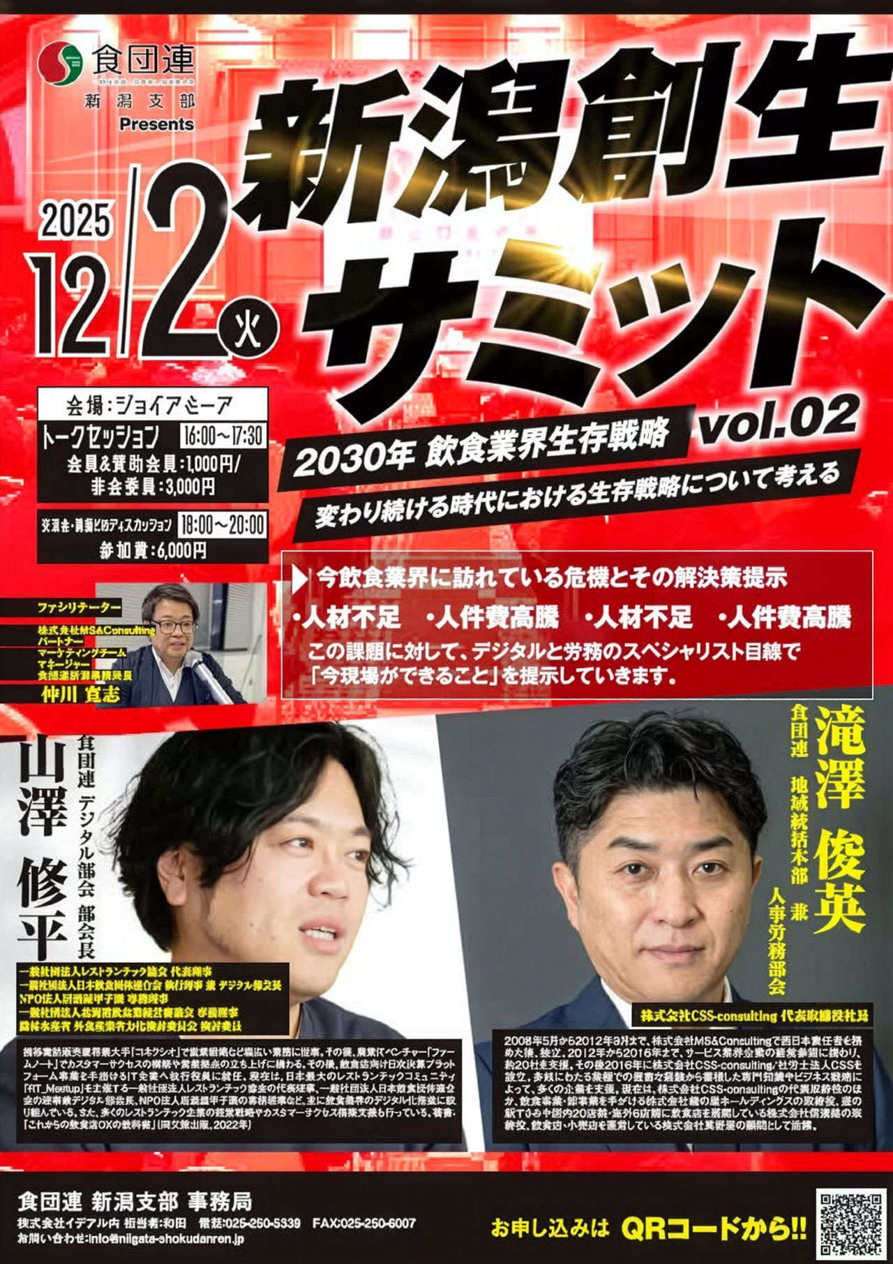 【12月セミナーのお知らせ】食団連 新潟県支部 presents「新潟創生サミット 2030年 飲食業界生存戦略 変わり続ける時代における生存戦略について考える」
